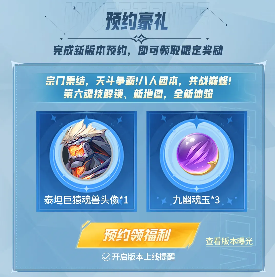 全新宗门玩法天斗争霸,热血八人团本、强力第六魂技、新地图新剧情全新体验~完成新版本预约,即可领取泰坦巨猿头像、九幽魂玉等限定奖励。