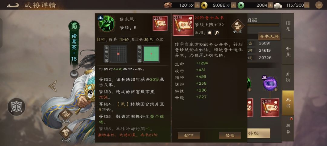 首先,历战里面的角色的属性是相对固定的,也就是说不管你是五阶神兵还是一阶,神品装备还是普通装备,进战场里的数值都是固定的。只有你的技能等级,星符效果,和战场战阵及羁绊能影响角色的数值和伤害!所以我们只要获得四张诸葛亮卡并把诸葛亮至少升级到9星,配合22阶兵书就可以激活他的全屏风啦!