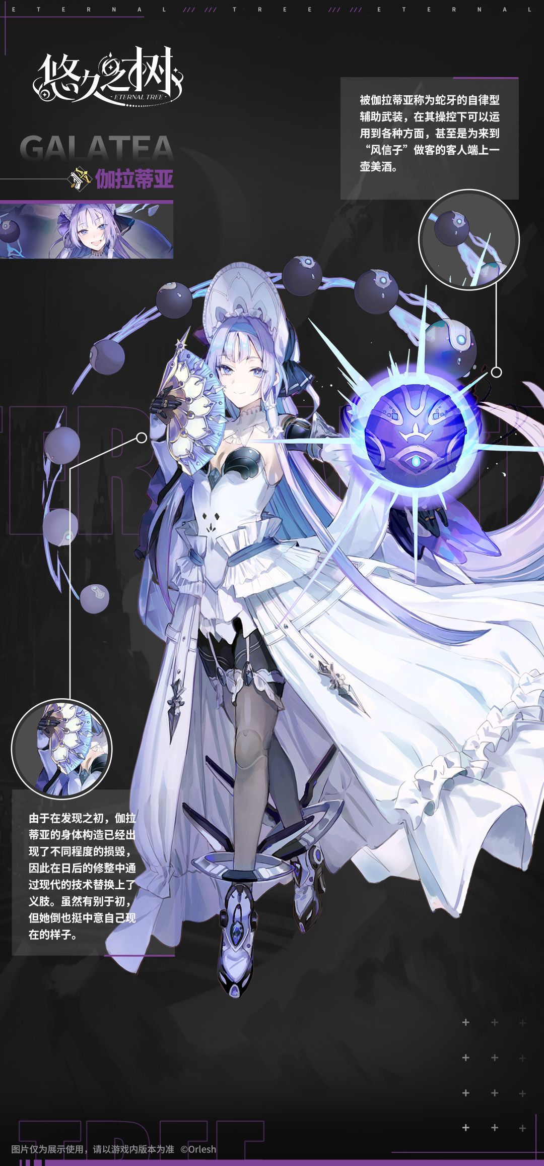 亚尔夫海姆高档酒吧“风信子”的首席驻唱,“风信子的女王”,优雅从容,俐齿伶牙。婉转空灵的歌声吸引了众多来客,登场日当晚更是一座难求。伽拉蒂亚从不特地遮挡义肢,显眼的人工关节从未影响她的倩丽,不如说反倒平添了如残缺新月般的神秘娇美。她的假面精致无瑕,“风信子”的常客亦未发现她的秘密——她其实是机关人偶。