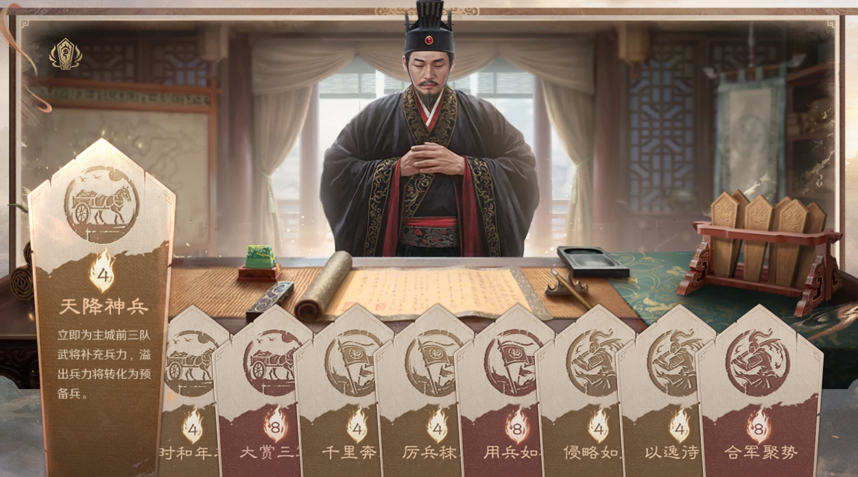 「军略台」解锁后,主公们每日都能抽取各种军略。军略根据其实际使用效果分为「内政」、「战斗」、「军争」三种类型,使用仅需消耗「军略点」,每日可获得固定数量的「军略点」,且具体数量将随军略台等级逐渐提升。