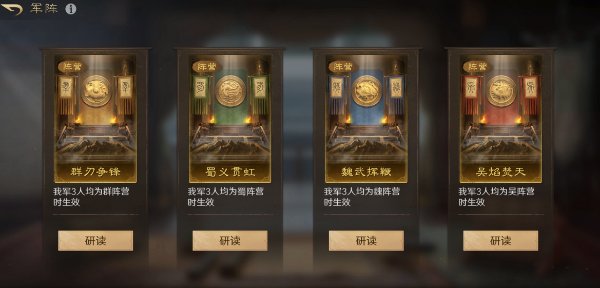 开启时间:新赛季第二天会解锁「沙场点兵」第二章内容,闯关成功后可解锁1个「阵营战法」,可研读战法数量随沙场点兵关卡解锁,最多可研读4个「阵营战法」。
