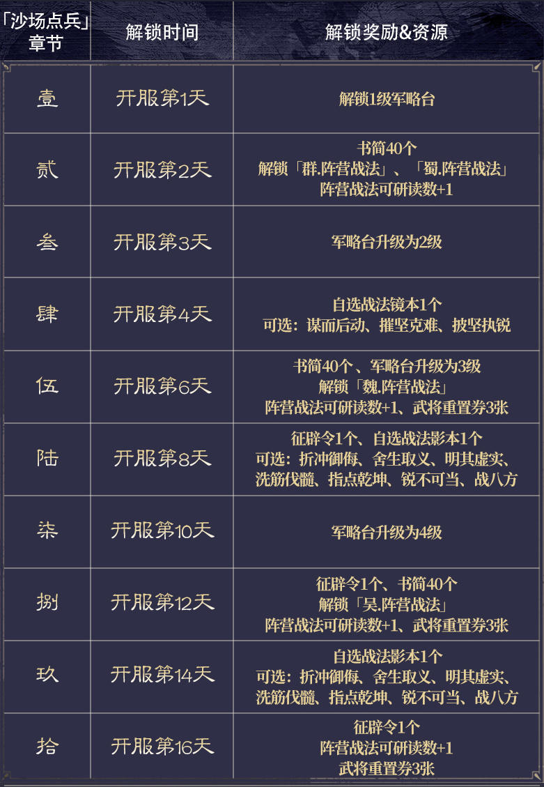 开启时间:新赛季开服当天,解锁「沙场点兵」第一章内容,闯关成功后可解锁「军略台」。