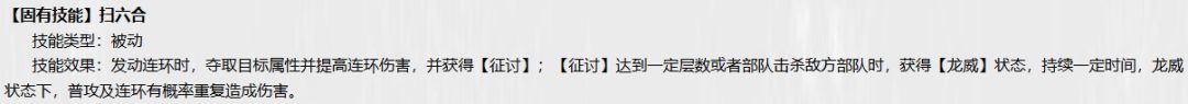 他的固有技能是扫六合,是一个被动技能,技能效果是发动连环时夺取目标属性并提高连环伤害,且获得一个【征讨】的状态。【征讨】状态达到一定层数或者部队击杀敌方部队时,获得【龙威】状态,持续一段时间,在【龙威】状态下普攻及连环有概率重复造成伤害。