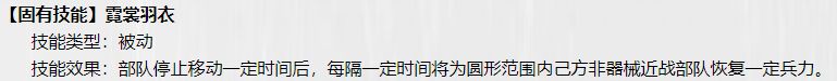 她的固有技能是霓裳羽衣,技能类型是被动。技能效果是部队停止移动一定时间后,每隔一定时间为圆形范围内的己方非机械近战部队回复兵力。这个技能比较有意思,这是王于兴师首次引入这种范围恢复类的技能,之前唯一的另外一个范围增益类技能就是戚继光的鸳鸯阵,这是第二个。所以我觉得这是非常重要的一个改变,意味着未来可能会有更多的这种群攻类,或者是群体治疗类的技能会被投放进来。