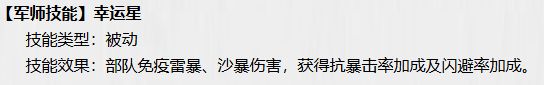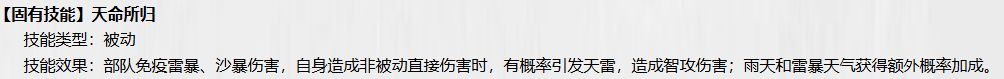 然后他的固有技能叫做天命所归,是一个被动技能,技能效果是部队免疫雷暴,沙暴伤害,且自身造成非被动直接伤害时,有概率引发天雷造成智攻伤害,雨天和雷暴天气获得额外的概率加成。