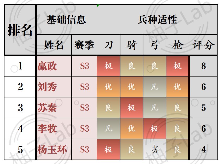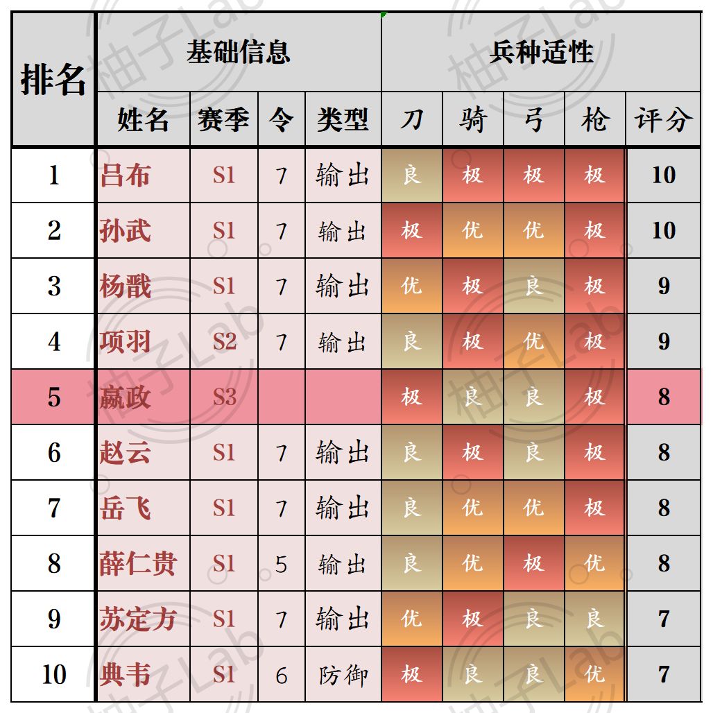 首先是我们的霸业武将嬴政。可以看到,他的兵种适性是刀兵极,骑兵良,弓兵良,枪兵极。按照柚子自己的评分标准的话,嬴政的兵种适性可以给到8分,还是很不错的。在三个赛季的所有武将中他可以排到并列第五。