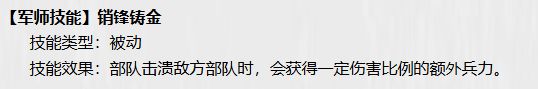嬴政的军师技能是销锋铸金,效果是部队在击溃敌方部队时会获得一定伤害比例的额外兵力,这相当于一个护盾效果,可能前期开荒的时候会有一定的作用,但是不知道具体的数值是多少,得等后续霸业卡包开放预览之后才能知道具体强度了。