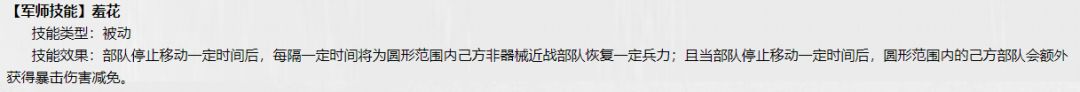 她的军师技能是羞花,技能类型是被动技能,效果为部队停止移动一定时间后,每隔一定时间将为圆形己方非器械近战部队恢复一定兵力,且当部队停止移动一定时间后。圆形范围内的己方部队会额外获得暴击伤害的减免。她的军师技的前半段描述和她的固有技能是一样的,可能数值上会更多一些,因为军师技能的数值一般都会比固有技能多一些。她军师技的后半段就比较有意思了,后半段是获得暴击伤害减免,对我来说这更像是一个专门针对二赛季项羽的一个技能。
