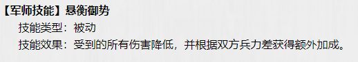 它的军师技能是悬衡御势,技能类型是被动技能,技能效果是受到的所有伤害降低,并根据双方兵力差获得额外加值。目前也是不知道这个技能的具体数值,如果它的数值很高的话也许可以替代掉一赛季的妲己的位置,作为一个肉盾的军师。