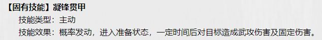 他的固有技能是凝锋贯甲,是一个主动技能,技能效果是概率发动,进入准备状态,一定时间后对目标造成武功伤害以及固定伤害。这个技能比较像远程版的【蓄力一击】,也是需要进入准备状态之后才会对目标造成伤害,不过这个技能它带有一个固定伤害,再加上上一个更新周亚夫的技能已经不能免疫固定伤害了,所以预测这个会是对自爆队以及反击队的一个克制技能。