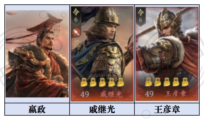嬴政的技能就注定了他属于连环枪阵容,组队首先可以组一个嬴政、戚继光以及王彦章的连环队伍,目前还不知道嬴政的这个技能会不会触发戚继光的固有技能,如果能触发戚继光的固有技能的话,那么他是非常强力的。配合上戚继光的无视魄力的话可以造成非常恐怖的输出。当然他也可以和岳飞组队,就是针对怒气队的克制队伍。