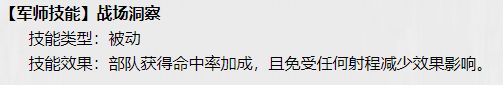他的军师技能是战场洞察,是一个被动技能,部队获得命中的加成,且免受任何射程减少效果的影响。这个免受任何射程减少效果影响,目前能想的应用场景就两个,一个是副将为养由基,它会是整个部队的射程-1;另一个就是在夜晚的时候,弓兵的射程会有所减少,李牧就可以作为夜晚的军师来使用。