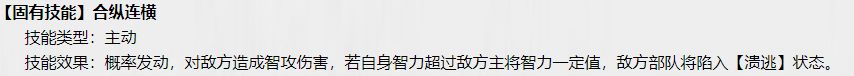 他的主动技能是合纵连横。是一个主动技能,它的技能效果是概率发动,对敌方造成智攻伤害,如果自身智力超过敌方主将一定的智力,将使敌方部队陷入溃逃状态。这个技能给我的感觉就像是一个智力版的鬼神乱舞,同样是需要计算己方与敌方主将的智力差值,才能触发二段伤害。所以他的定位应该也是一个智攻类副将,类似贾诩,以及上面的刘秀。