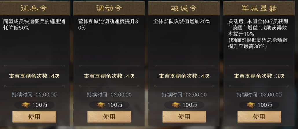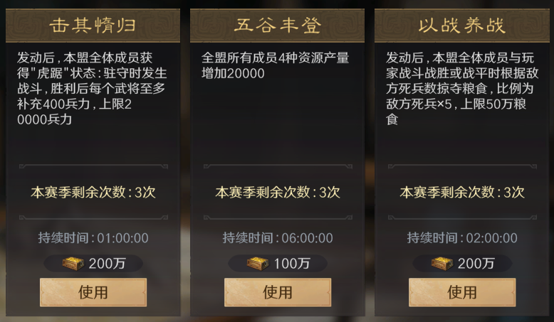 本赛季同盟科技焕新,同盟科技以科技树的形式登场,需要提前解锁第一个科技树才可以依次往下解锁,这里需要注意的是,现在的同盟科技将拥有使用次数上限,使用次数已耗尽就无法再次使用,计策无法同时使用,一次只能生效一个,故指挥上的衡量判断需要谨慎,战场上的野战攻防、城池攻防则更考验同盟指挥决策。