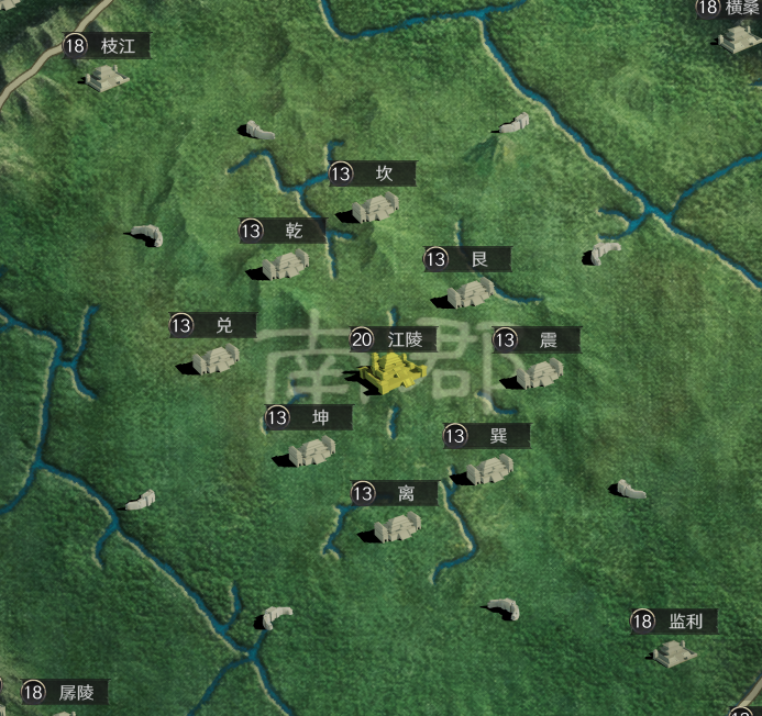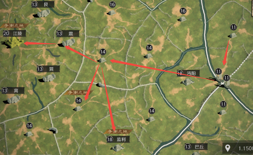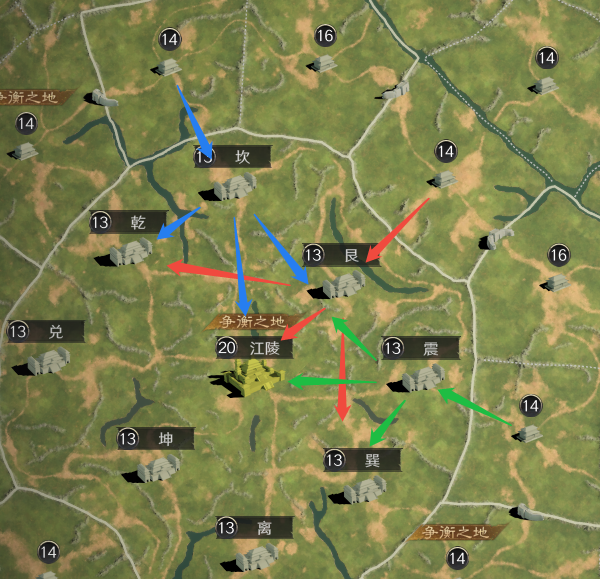 从震重镇到江陵/巽重镇,此处预测也将会是中心州第一次大规模的接站点,当我们在第二个重镇争夺作战失利的情况下,也可退守第一个重镇构筑第一道防线后,利用重镇、争衡之地无法迁城的特性,会让优势方拉长战线,失利方则可利用盟友联动配合支援,养精蓄锐准备布局争衡之地的争夺,以豫章进南郡为例: