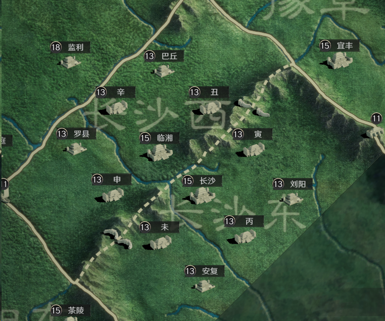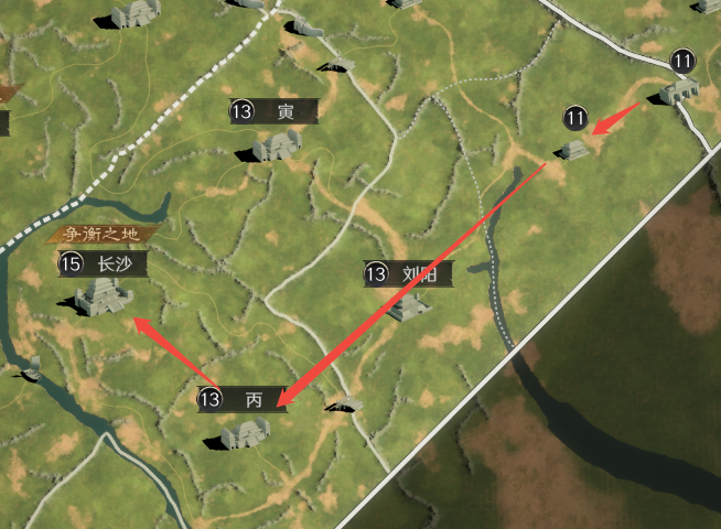 在进入二级资源州双方争夺的城池为对称分布,由于争衡之地无法迁城调动委托,也无法生成存储辎重,故前期主战场需要围绕着重镇进行对抗,靠近重镇的13级城池则尤为重要,围绕着最近抵达争衡之地的重镇进行铺路,此处预测也会是第一次大规模的接站点,在第一个重镇争夺作战失利的情况下,也可退守13级城池构筑第一道防线后,转战下一个重镇,准备布局争衡之地的争夺,以长沙东为例: