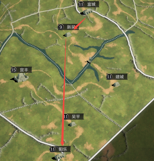 本赛季还是拥有传檄而定,故出生州开城必定选择立国来使用传檄而定机制,确保后续开关能够有效激活传檄而定机制并拿到对应攻城大营。出生州进资源州的两个传檄关卡选择任意一个都可进行传檄而定,重复占领另一传檄而定关卡无效果。以孙权阵营鄱阳为例: