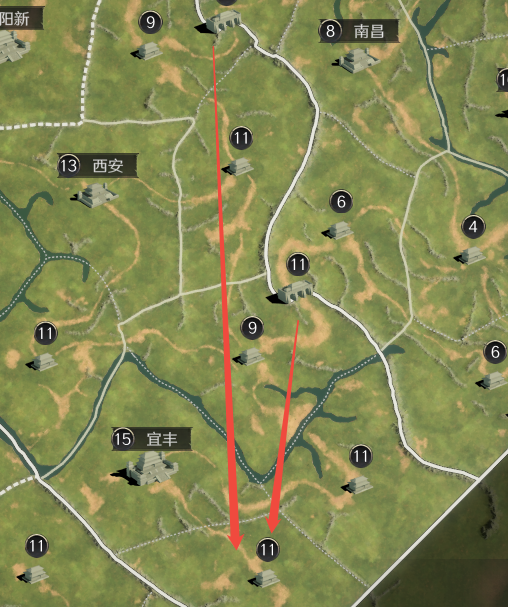 一级资源州不会进行接战,同盟在保证前线铺路的前提下还是以发育为主,可在开关后尽快铺路打掉第一座九级城并尽快建起铁矿厂,开始攒精铁并等待传檄而定的待诏城池攻城大营完成后占领待诏城池,往进二级资源州的关口11级城铺路。以豫章为例: