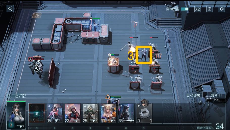 按照图示依次上阵【赛卡卡】(1)、【芮尼】(2),赛卡卡在掩体内负责扛伤&输出伤害,芮尼在增益位置,可以持续加血,保障赛卡卡存活的更久