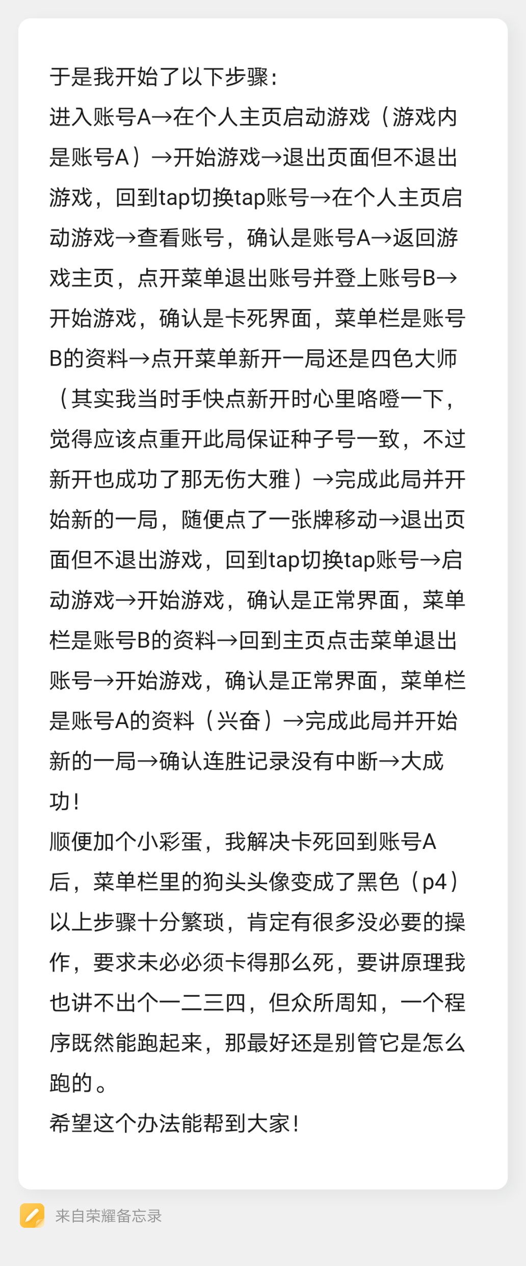 能解决卡死bug对我来说是有运气成分在的,幸运点之一就在于那次开小号刷种子的经历让我知道了游戏内的账号不会跟着tap账号一起切换。