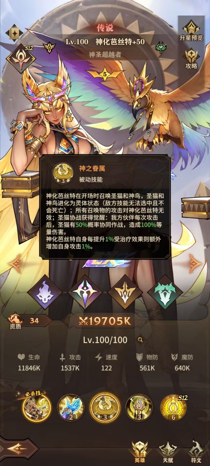 升华巴斯泰特为辅助型英雄,战斗开始时会召唤“圣猫”与“神鸟”,且自身免疫所有召唤物的攻击。