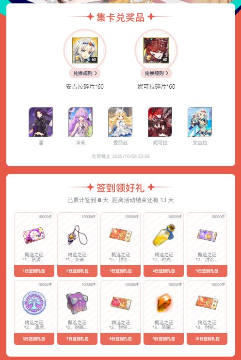 签到活动开启,累计签到10天,领取封铭籍、精选之证、失落之境等超值奖励!集卡赢SSR伙伴安吉拉!
