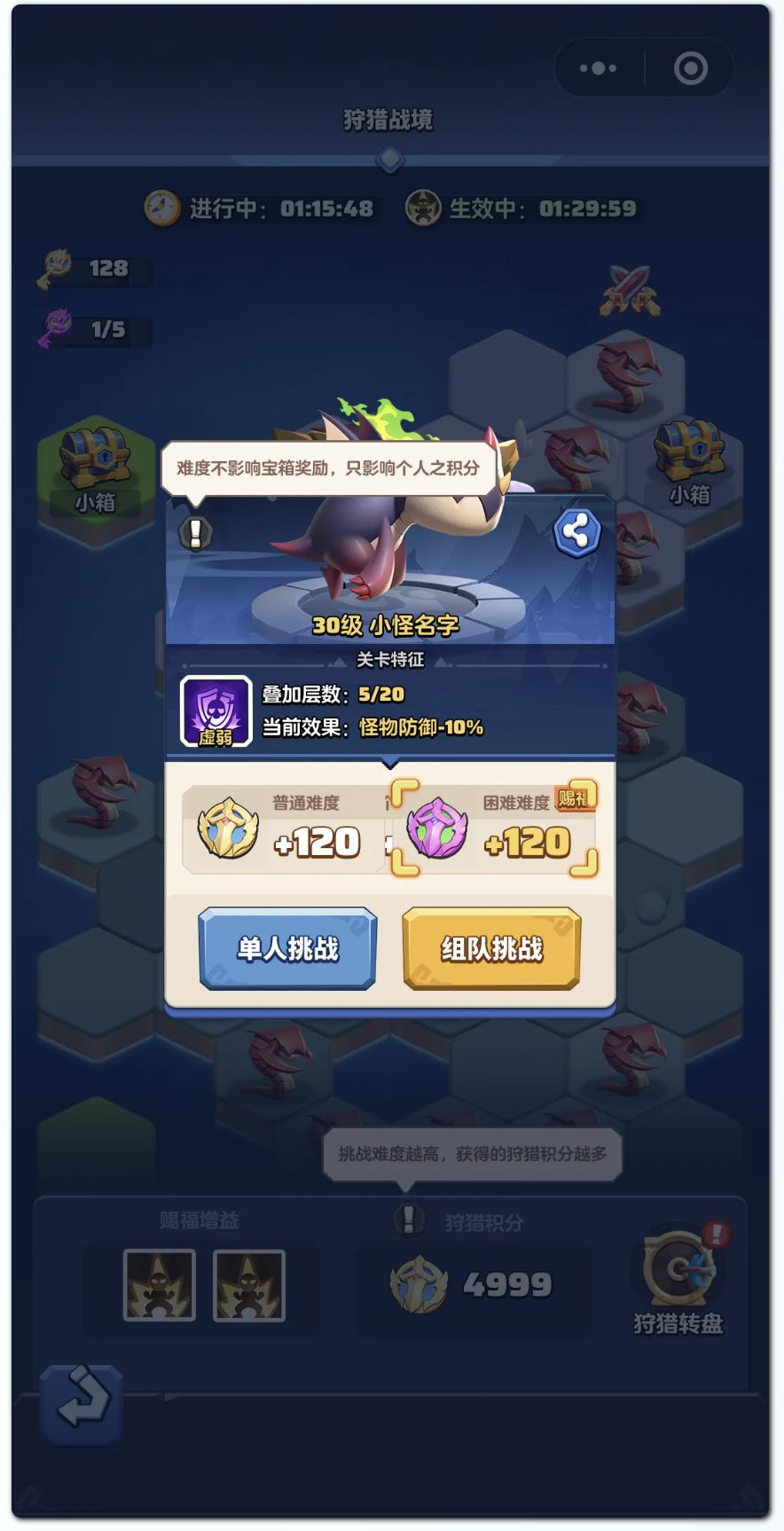 部分困难难度的关卡还可以选择赐福加成,挑战强度更高的怪物,获取到更多的个人积分。