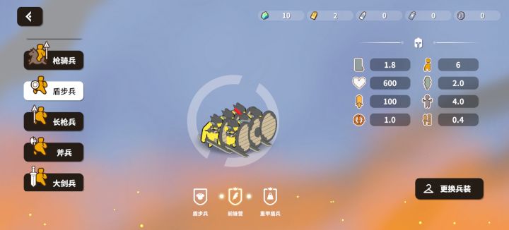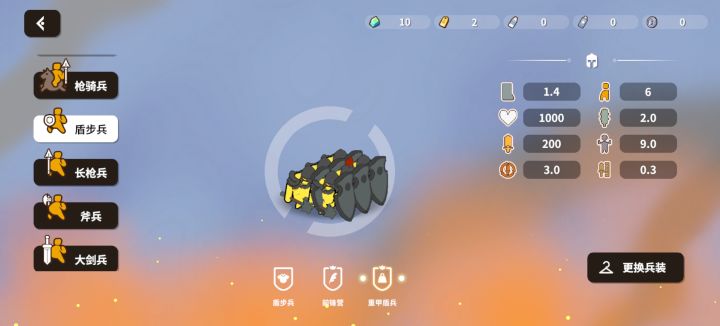 盾兵在游戏中的定位是抗伤,对远程具有一定抗性,通常开局点防御(可根据情况点疾走),同时盾兵具有格挡被动(需加点),但是要注意,不要将盾兵作为主力,他缺乏输出,全出盾兵会被队友骂死的