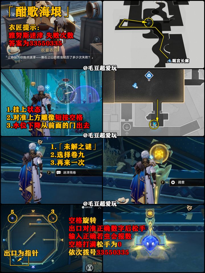 前往-1层3D房间内的传送点,降低水位后从右前方的门走出3D房间,迷津残卷选择卷9与一旁的机关交互开启解谜,解谜的原理类似老式拨号电话,这里把出口选为判定点是为了方便解谜,拨号正确若虫会报数,成功拨号出现宝箱。