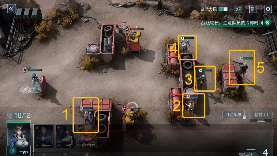 上阵参考:按照图示,依次上阵【重盾】、【突击】、【火力】、【突击】、【狙击】,剩余队员按照点击后提示位置上阵即可