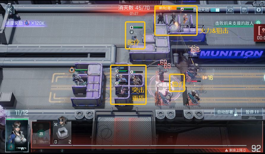 上阵参考:优先在【突击&重盾】区上阵2名队员,随后在【火力&狙击】区上阵一名火力队员,随后不要着急上阵队员,等【突击&重盾】下方小兵刷新后再上阵另一个突击队员,等中间小怪刷新,优先上阵克洛伊快速清掉,随后根据【突击&重盾】血量消耗上阵医疗队员,最后在无人机密集的时候上阵另外一个火力/狙击最大化沙鹰模组技能效果