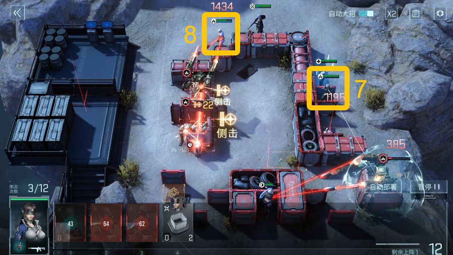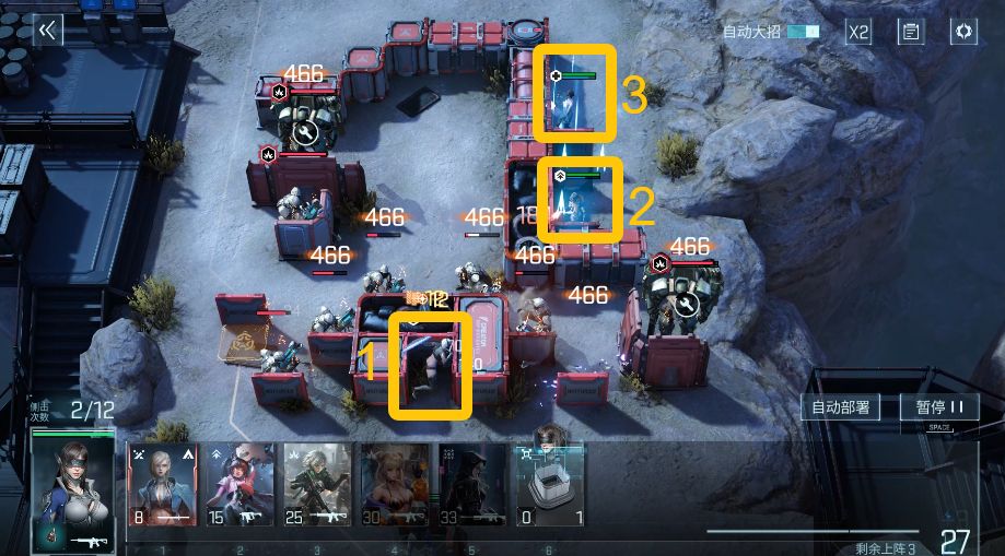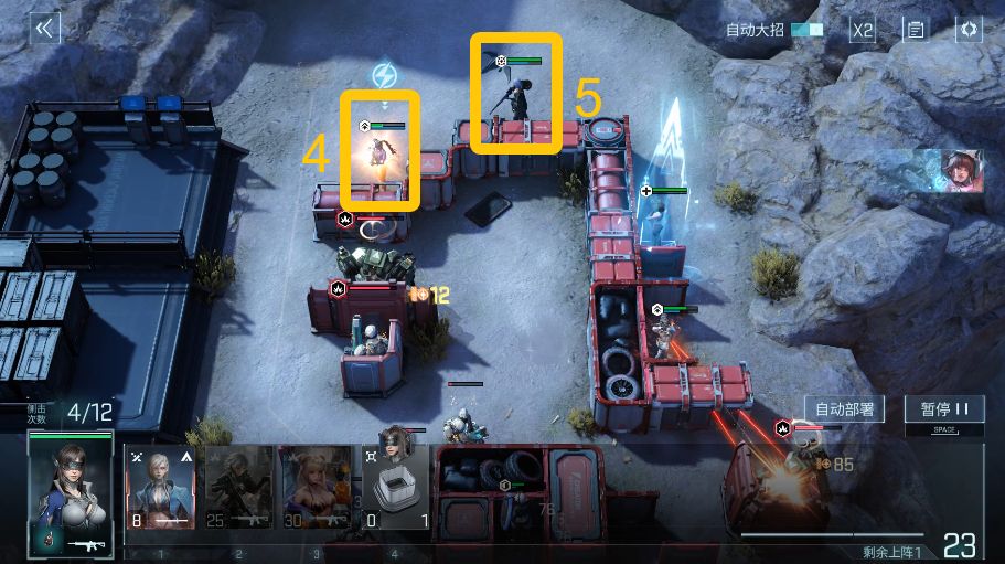 按照图示依次上阵【抽到的ssr/助战的突击】(4)、【伊莱塔】(5),另一个突击队员吸引上方boss火力,伊莱塔上阵时需要注意boss技能条,挑选蓝色条满-变为白色往回收缩的时候上阵,可同时击破两个boss最后一个弱点,打断boss技能释放
