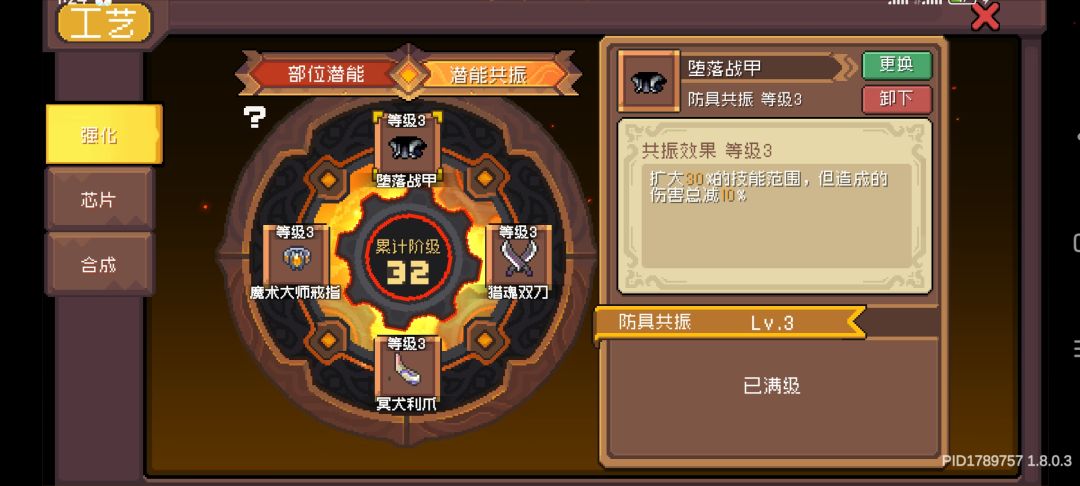 装备共振如图,爬塔会暴毙就把堕落甲换成征战骑士,首饰位只推荐魔术师戒指,尝试过共振困兽项链效果不好,魔术师快速刷新电锤冷却最优选择。
