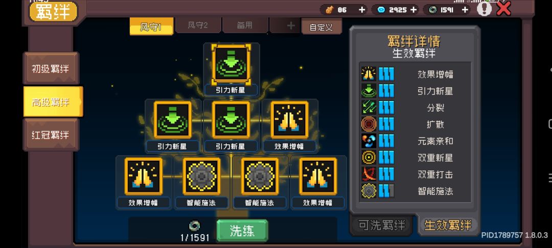 除了分裂之外没有选用投射物羁绊原因是近战范围类羁绊对电锤增强更高,引力新星聚怪增伤,效果增幅延长各类BUFF异常时间,扩散、双重新星、双重打击是电锤都可以吃到加成的羁绊,其中扩散和新星还可以给冰川领域加大范围,元素亲和增加元素伤害,智能施法一般只需要一个给电锤就好,我带两个另外一个给的是无敌,也可以不要。