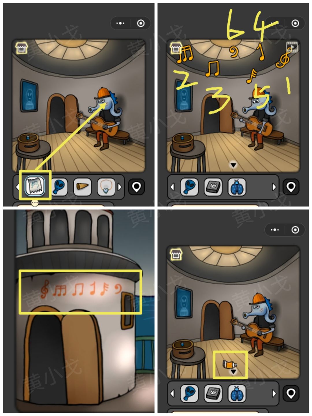 33.拿【乐谱】给海马人,根据[二楼右侧露台]场景灯塔墙上的音符线索,按顺序按下音符;拾取地上的【颜料】