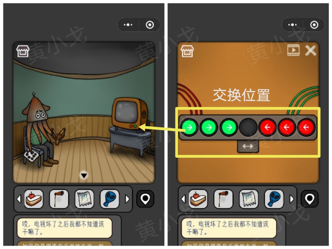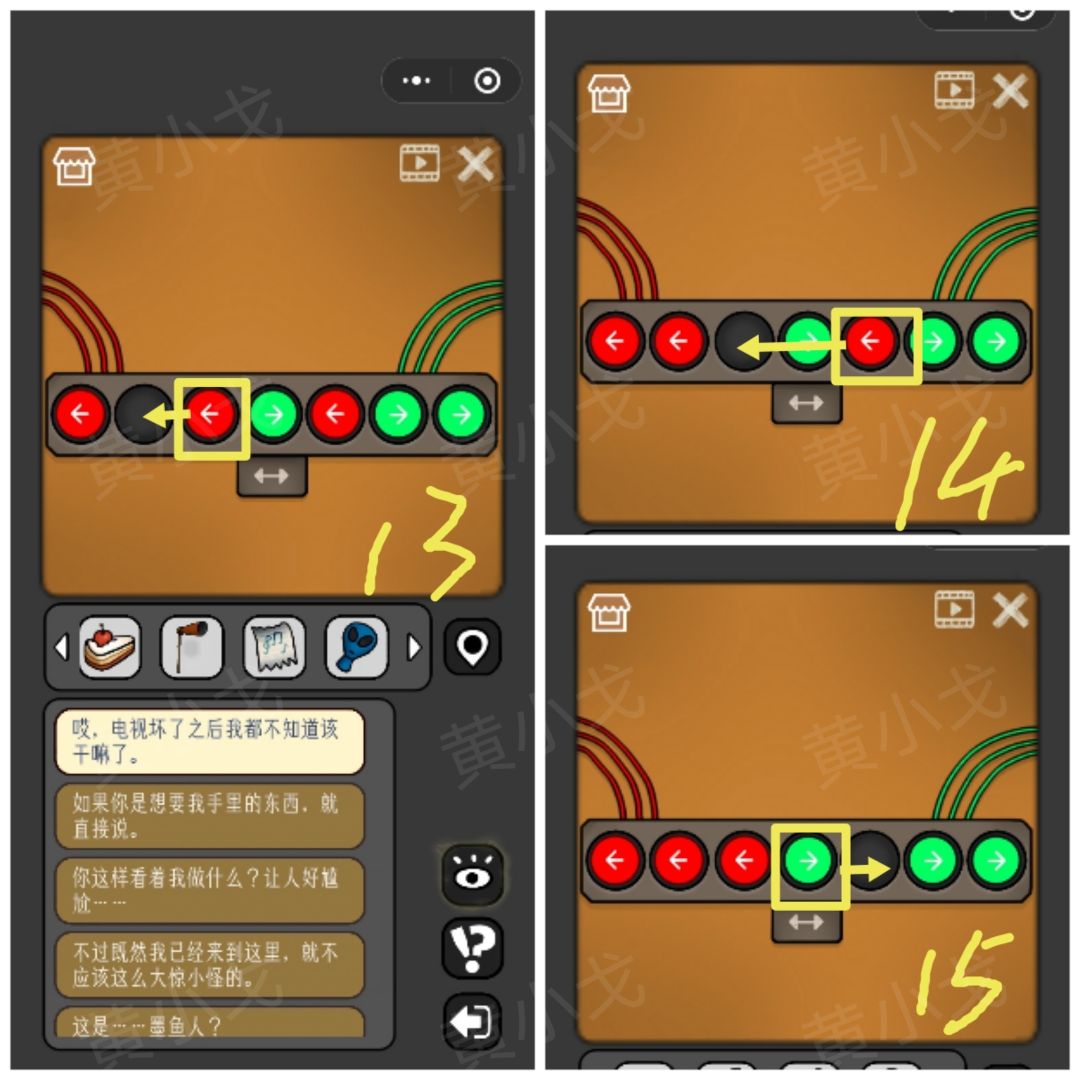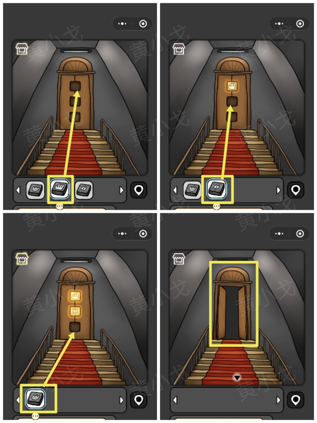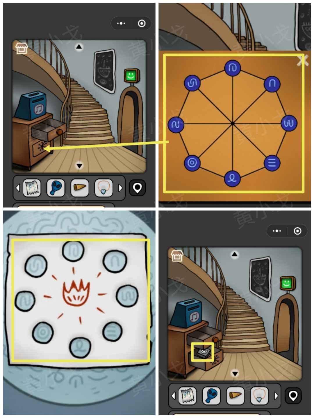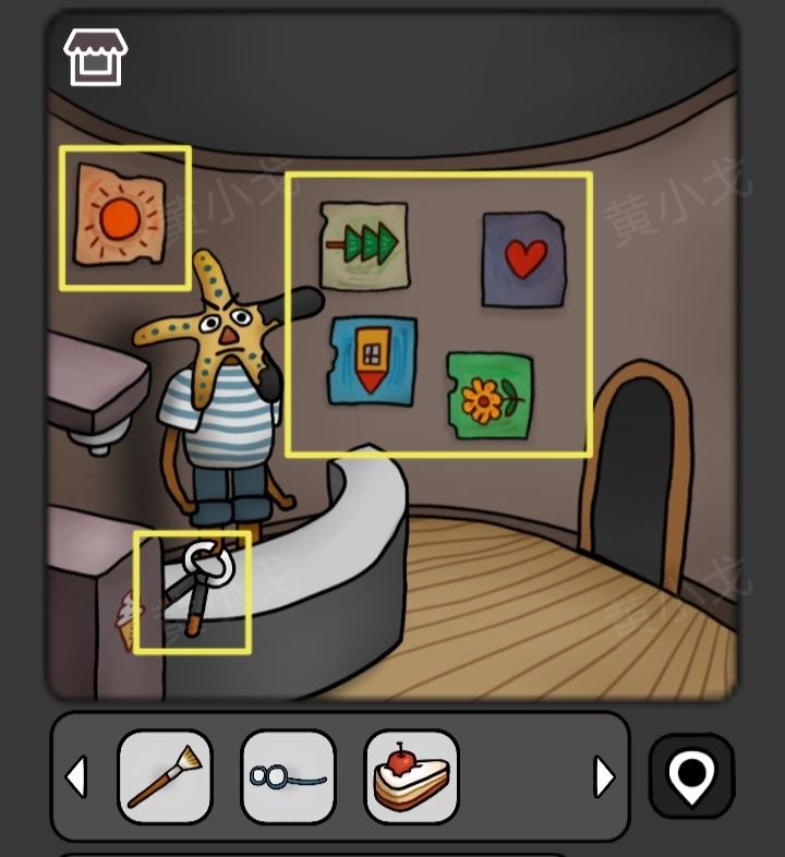 10.点击门上的机关,根据[三楼甜品店]画上的图案线索,调整机关,打开门