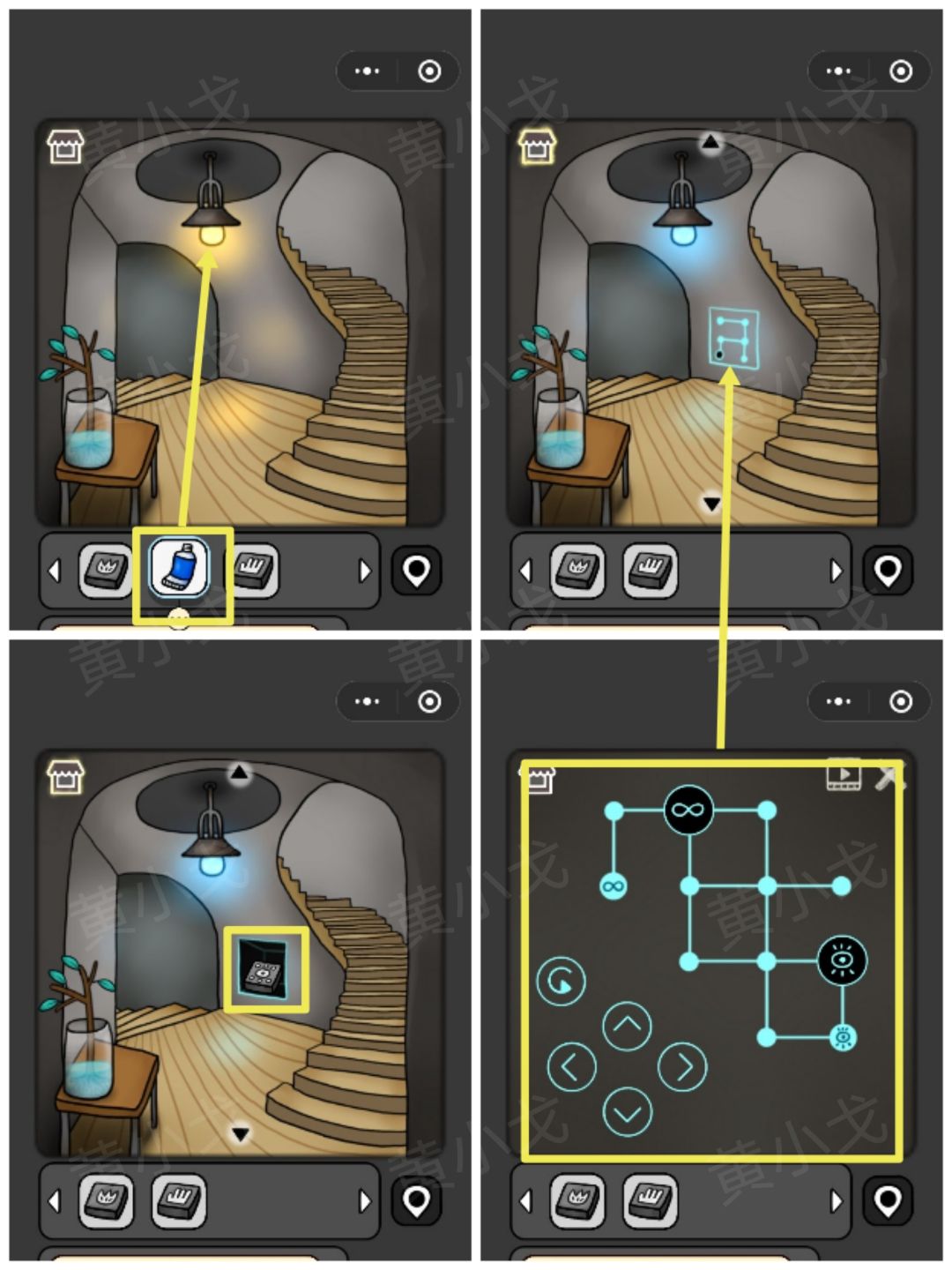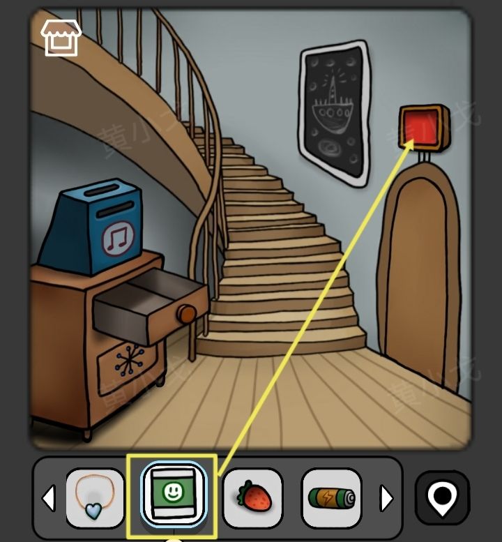 38.把【蓝色颜料】涂到灯泡上;点击墙上的机关,完成小游戏,打开暗格,获得【按钮】