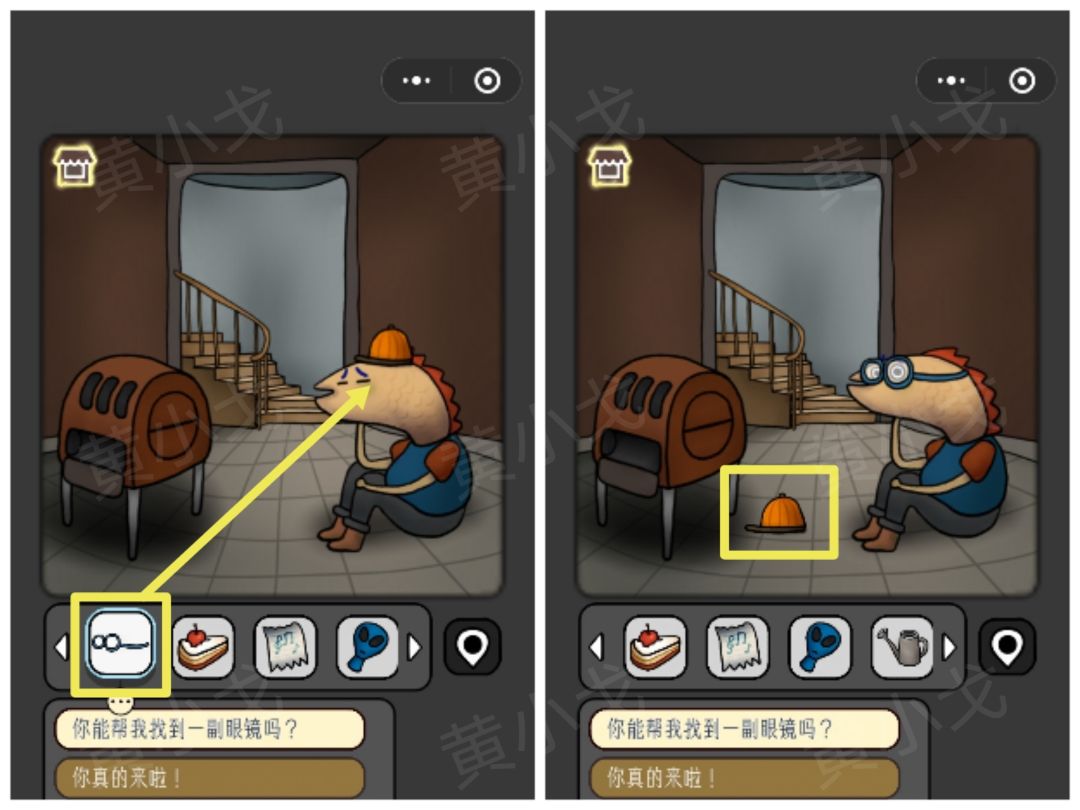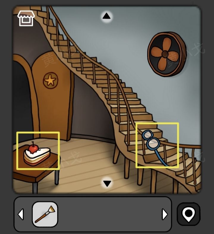 2.拾取桌子上的【蛋糕】;楼梯扶手上的【眼镜】
