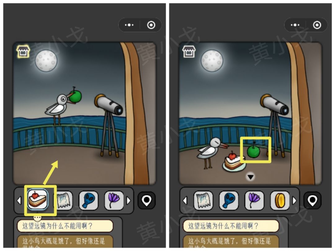 16.把【蛋糕】放到地上喂鸟,获得【青苹果】