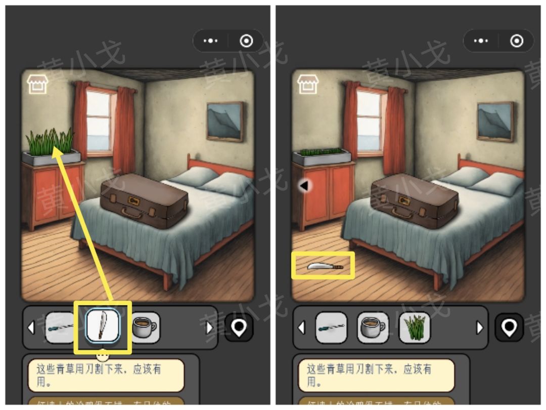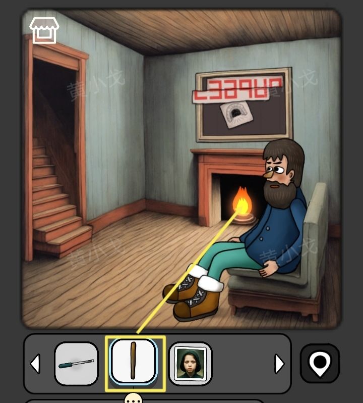 2.点击地上的机关,根据[木屋-客厅]场画上的线索,输入密码:23848,打开门