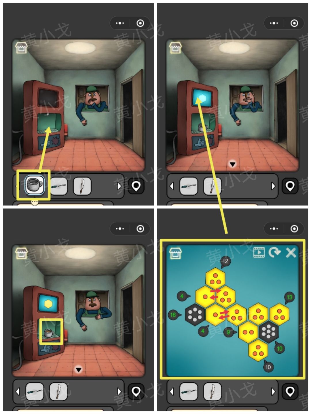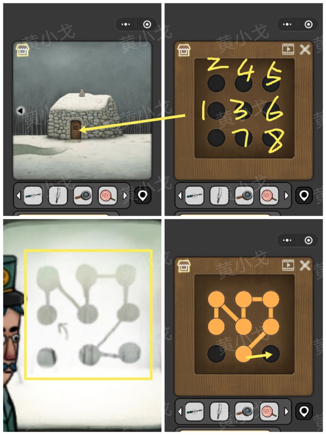 20.点击石屋门上的密码锁,根据火车窗玻璃上的图案,按顺序连接按钮