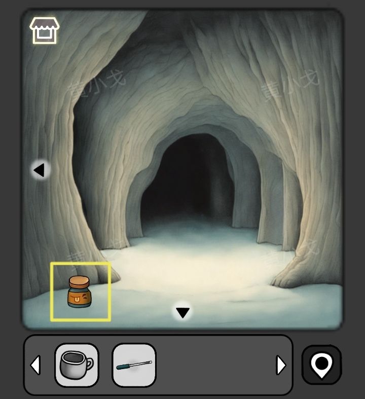 30.点击门上的密码锁,根据上面的符号提示,结合[石屋-房间]场景罐子上的符号及罐子中飘出的烟的叶片数量,输入密码:90504,打开门