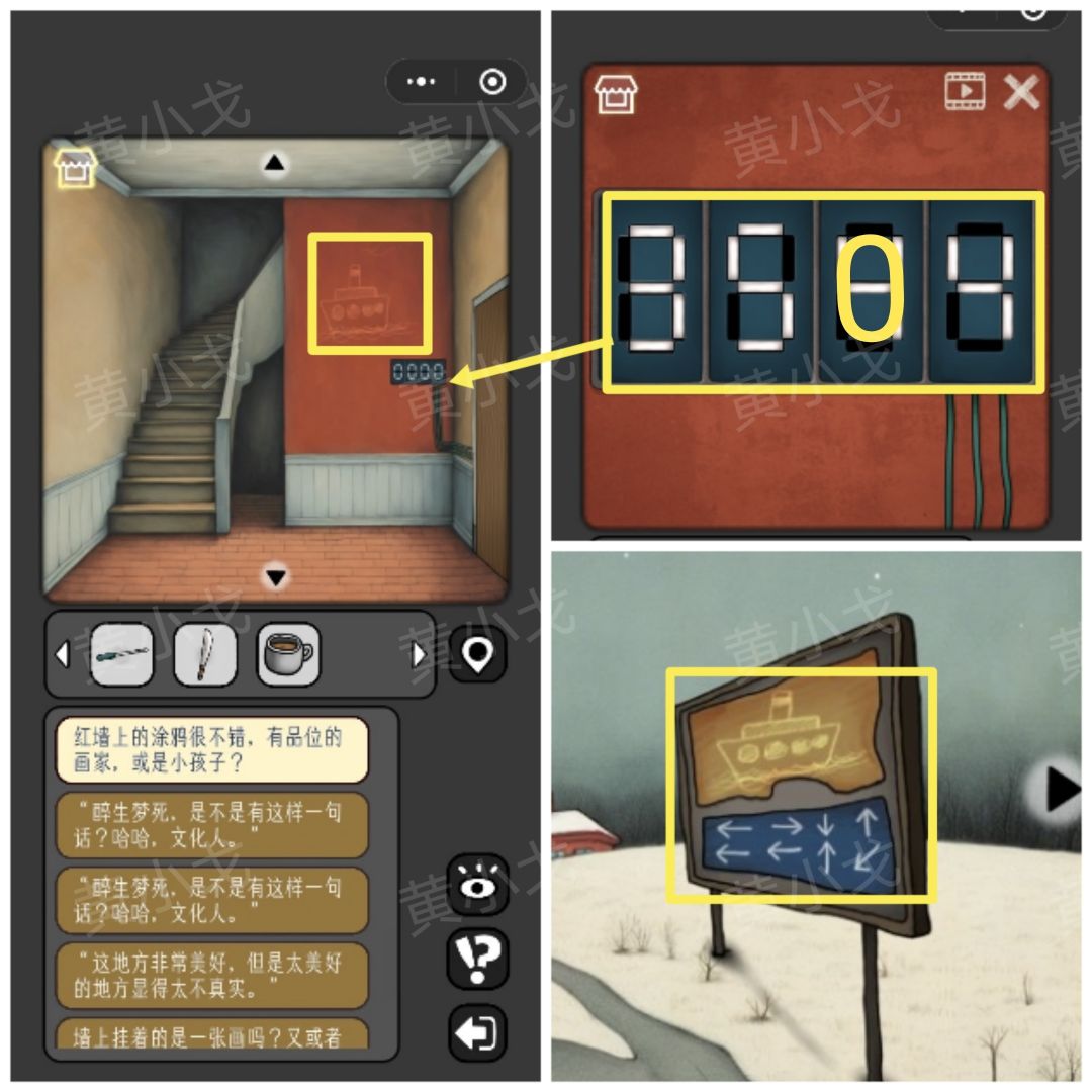 13.点击门上的密码锁,根据墙面上的涂鸦提示,结合[三岔口]路牌上的线索,输入密码:3504
