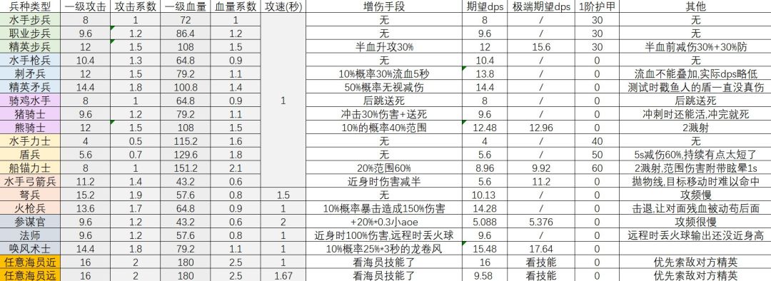 3.所有兵种都以水手步兵为数值根基,乘以兵种的攻血系数。举例:精英矛兵是1.8倍攻1.4倍血。