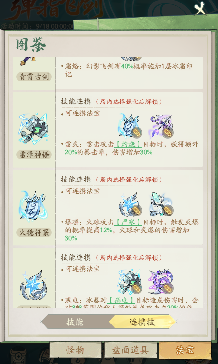 部分法宝之间存在连携效果,在局内可选择连携的法宝并激活连携技能触发额外效果,可在【图鉴】处进行查看。