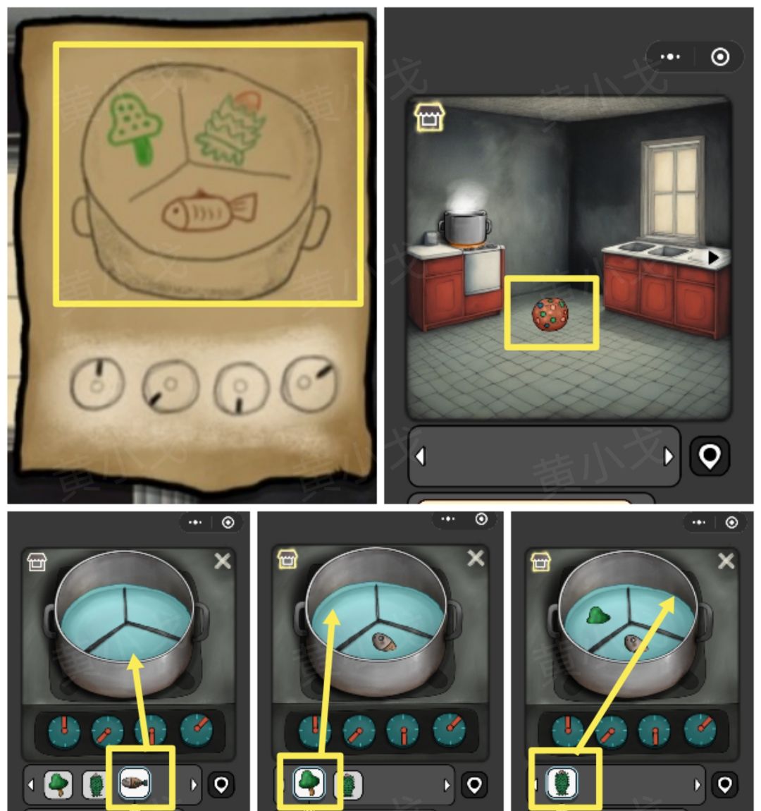 35.根据纸条上的线索,把【鱼】、【绿蘑菇】和【植物】放入锅中煮,获得【肉球】