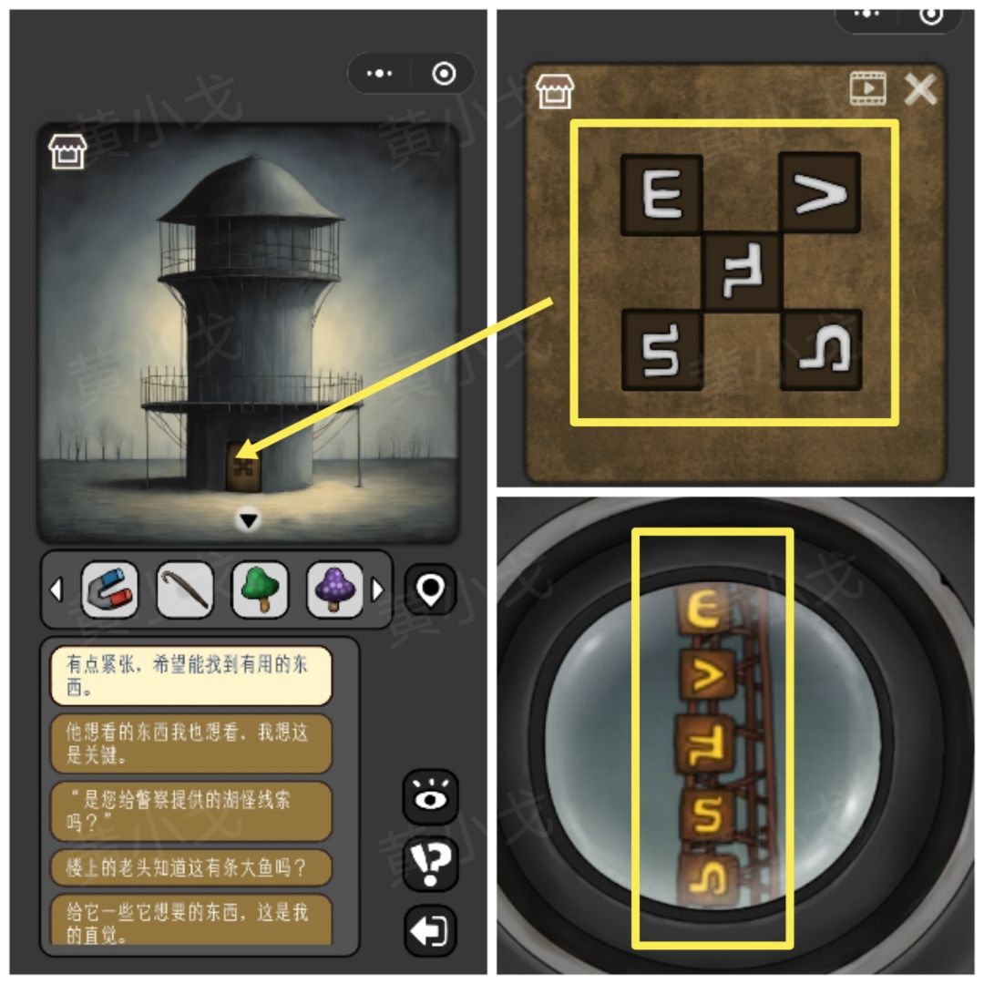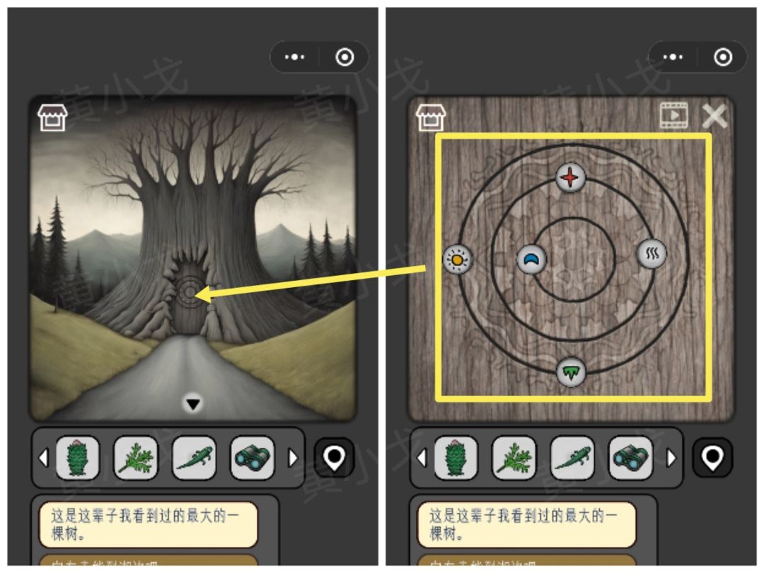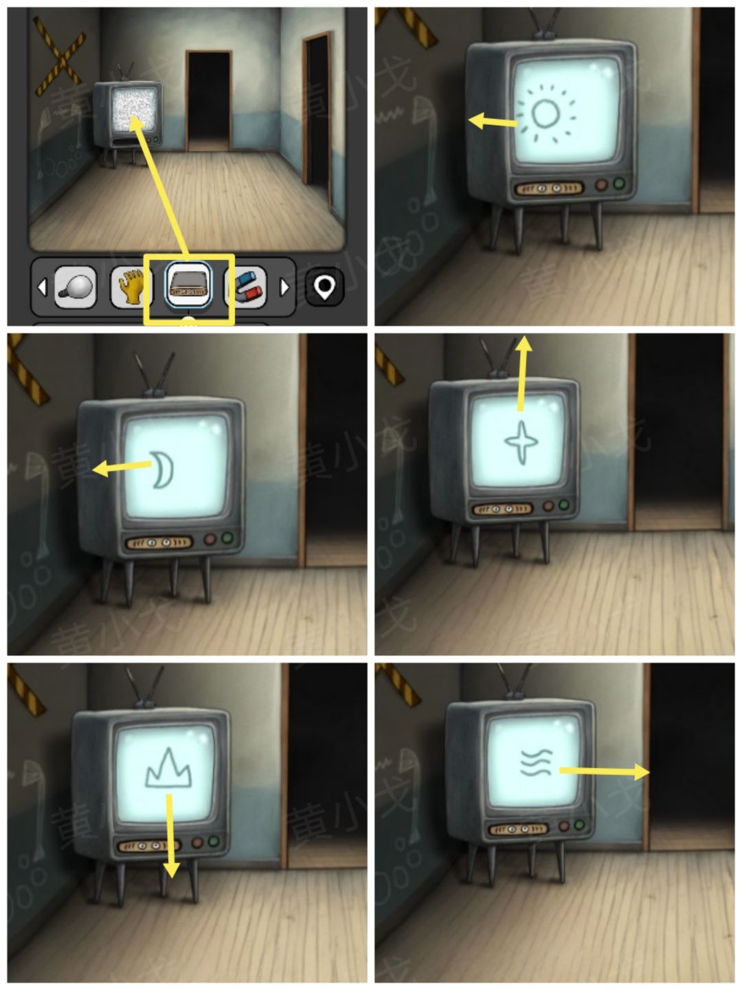18.点击大树上的机关,根据电视机画面出现的图案及位置,调整密码锁