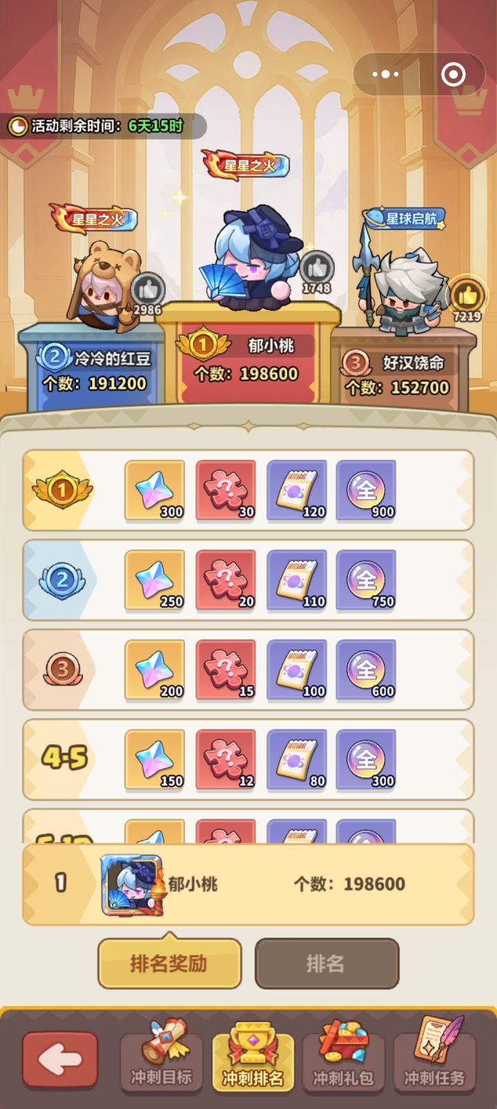 3.基本上有上面 2 套就可以应对大部分情况了,毕竟第一次也没那么多晶矿可以洗了。然后看排名,最后一天补一下,留点给下一次冲刺活动就可以。