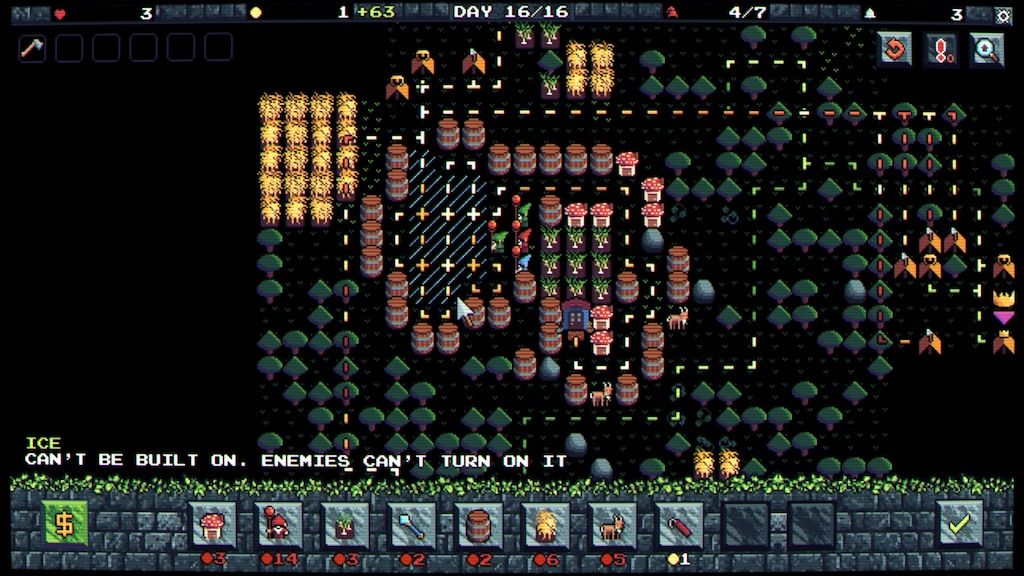 《矮人防线》用最简单的像素风,构筑了许多个不同环境区域的地图当关卡,森林、沼泽、沙漠等等应有尽有,每次进入的地图还都是随机生成的。不同的环境区域里会有相应更好生存的植物,而大多数植物就是我们防守之路上的经济来源。至于要怎么将经济来源最大化,就要看我们的“卡组构筑”能力了!这需要一点运气,还需要一些游戏理解力!