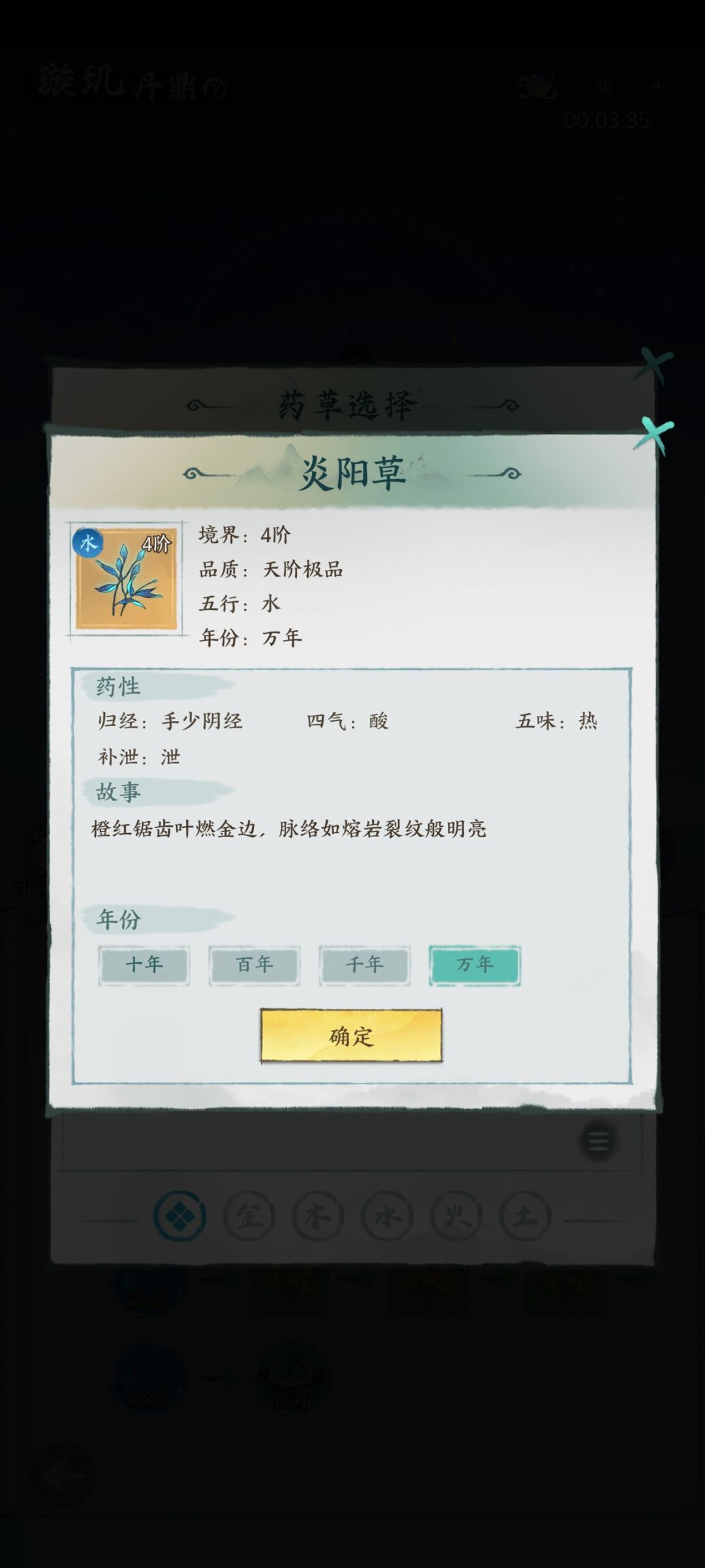 把炼丹技巧总结下来其实就一句话:除了最后三个药材放你需要属性的克制属性,其余全部放你需要的丹药对应的穴位的药材,且要将一半或以上的药材年份达到你需要品阶对应的年份。因为只能提升上限提升不了下限,所以除了一半或以上的药材是对应的年份,其他全部按十年放,能省则省,这里我举个例子,假如我要炼制火系炼神的天阶修为丹方,如下图所示: